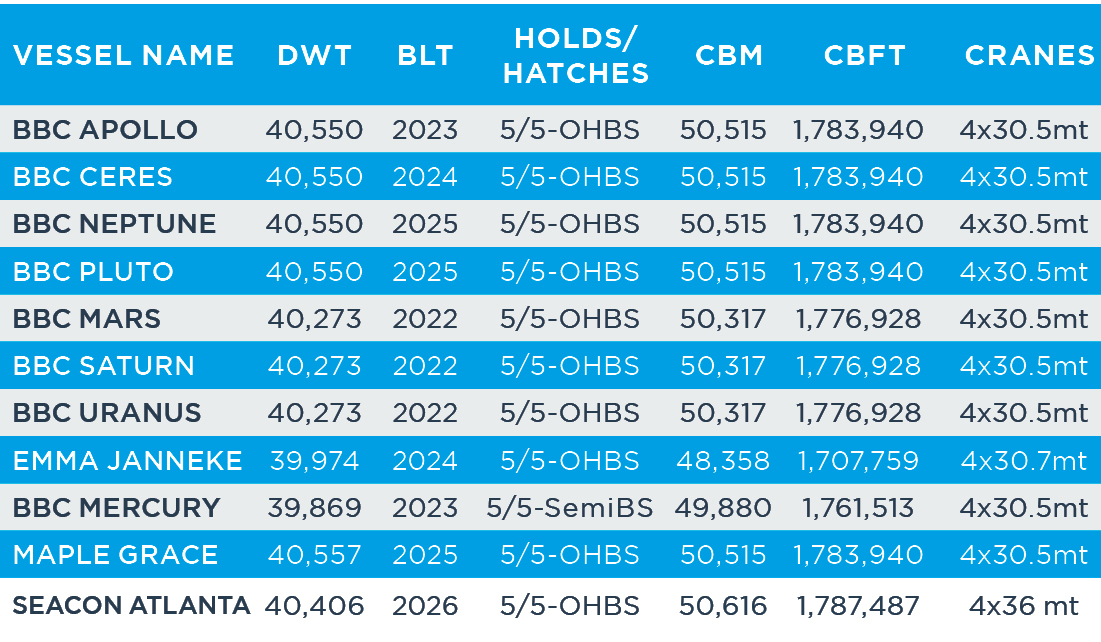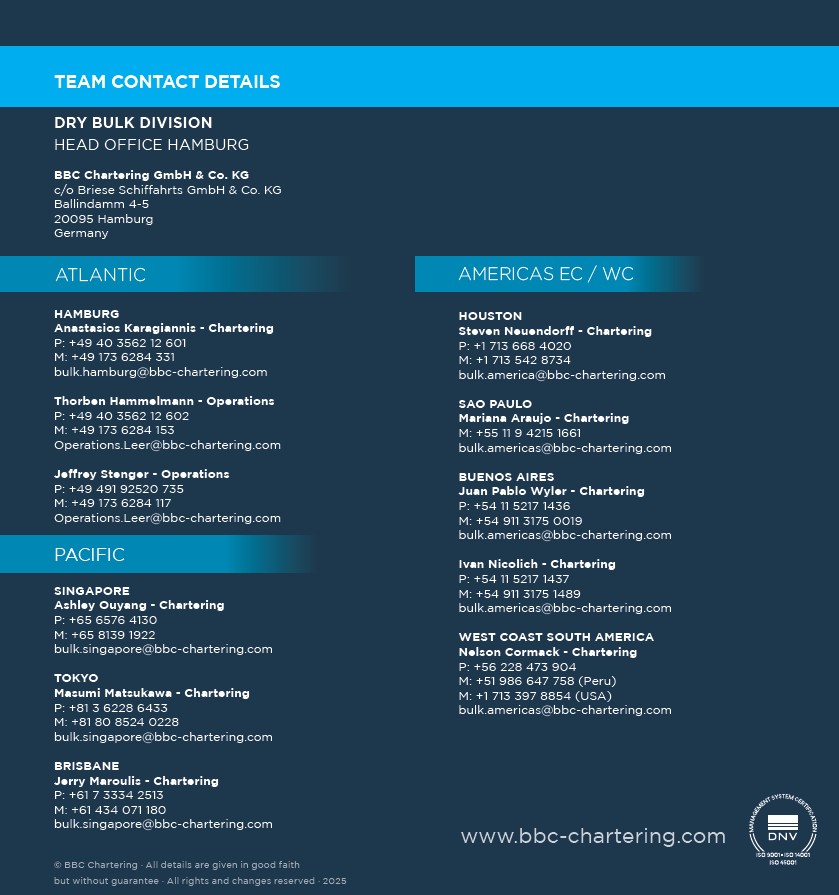 BBC Chartering's Dry Bulk Division is dedicated to the commercial, chartering and operational management of BBC Chartering’s bulk carrier fleet and to the dry cargo booking and market tonnage operating activities, in segments ranging from handysizes/handymaxes to the largest geared bulk carriers.
